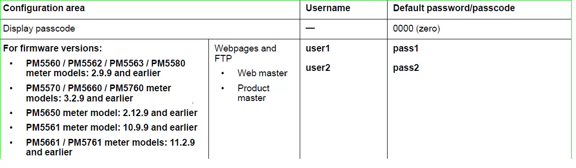 - Đồng hồ đo có một bộ thông tin đăng nhập mặc định để truy cập màn hình hiển thị phía trước, các trang web và máy chủ ftp.