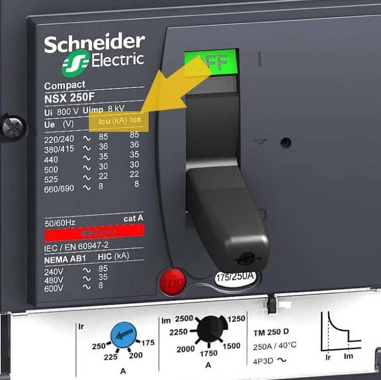 Một MCCB NSX250N 3P 250A mã sản phẩn C25N3TM250 có Icu = 50kA và Ics = 25kA (50%) → nếu ngắt dòng 25kA, thiết bị vẫn dùng được. Nếu cắt đến 50kA, có thể bị hỏng.