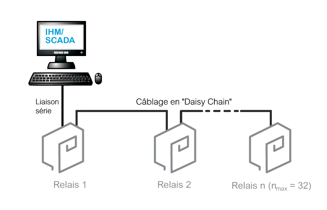 Kiến trúc này cho phép HMI/SCADA được kết nối với một bộ rơ le bảo vệ Easergy bằng liên kết truyền thông nối tiếp đa điểm với giao tiếp chủ-tớ.