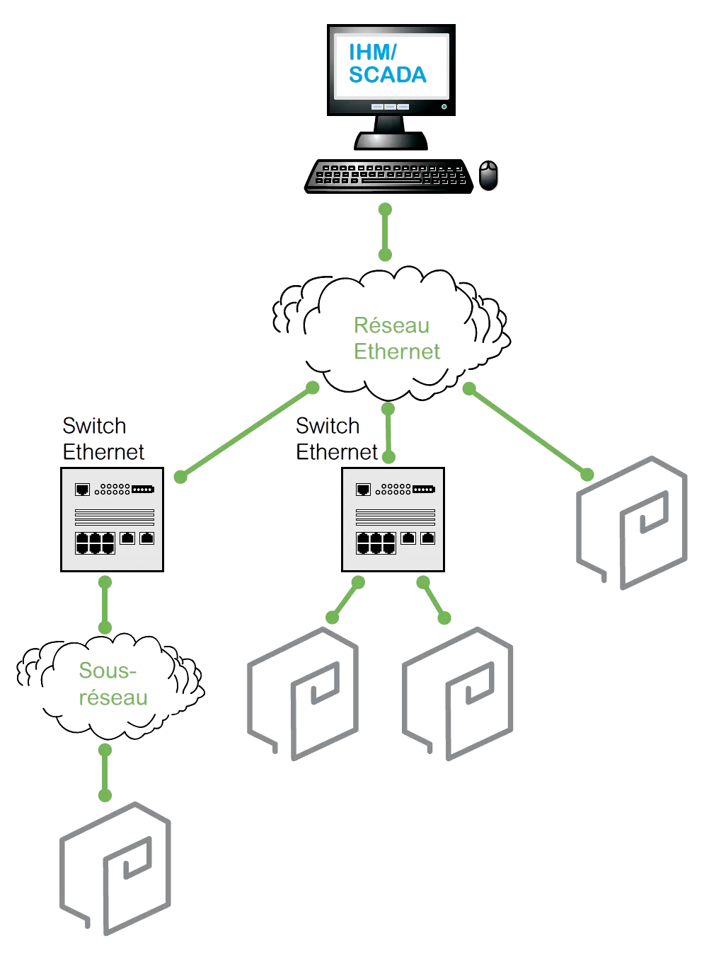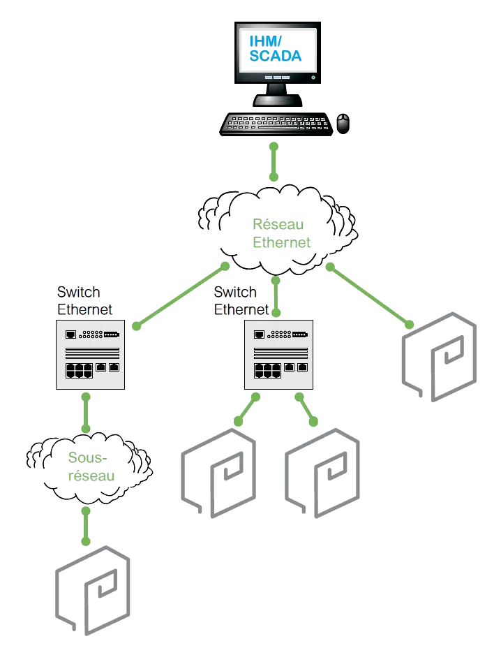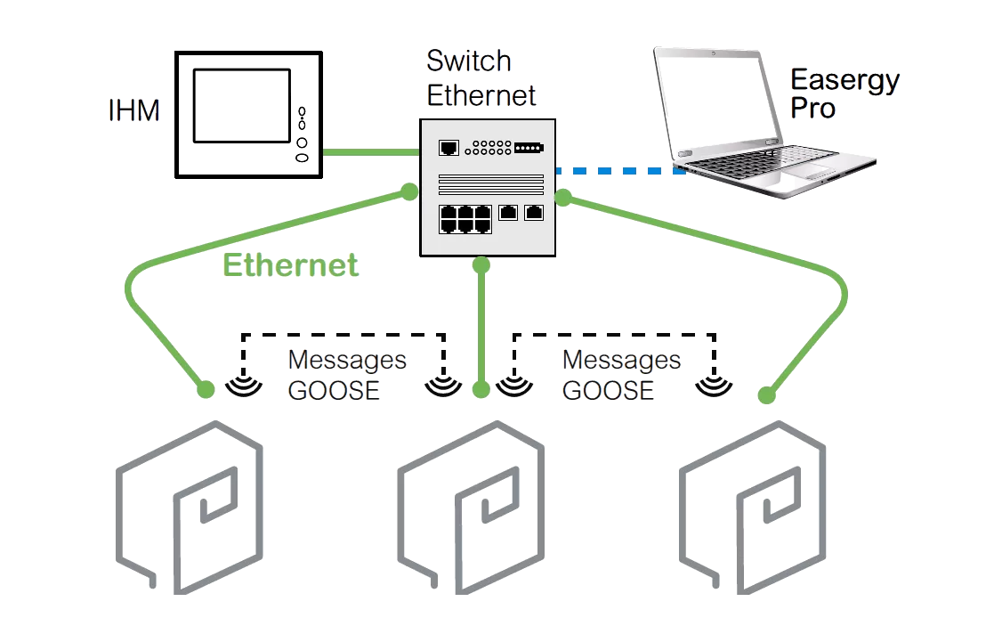 Kiến trúc này cho phép bạn kết nối một bộ rơle bảo vệ Easergy trực tiếp với mạng Ethernet.
