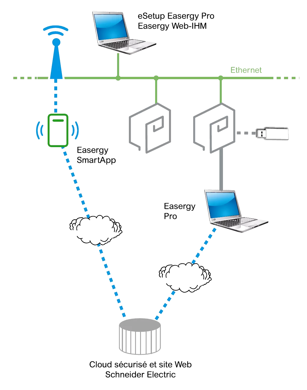 Pro có thể được kết nối với một rơ le bảo vệ Easergy duy nhất qua cổng USB phía trước hoặc với một nhóm rơ le bảo vệ Easergy qua Ethernet.