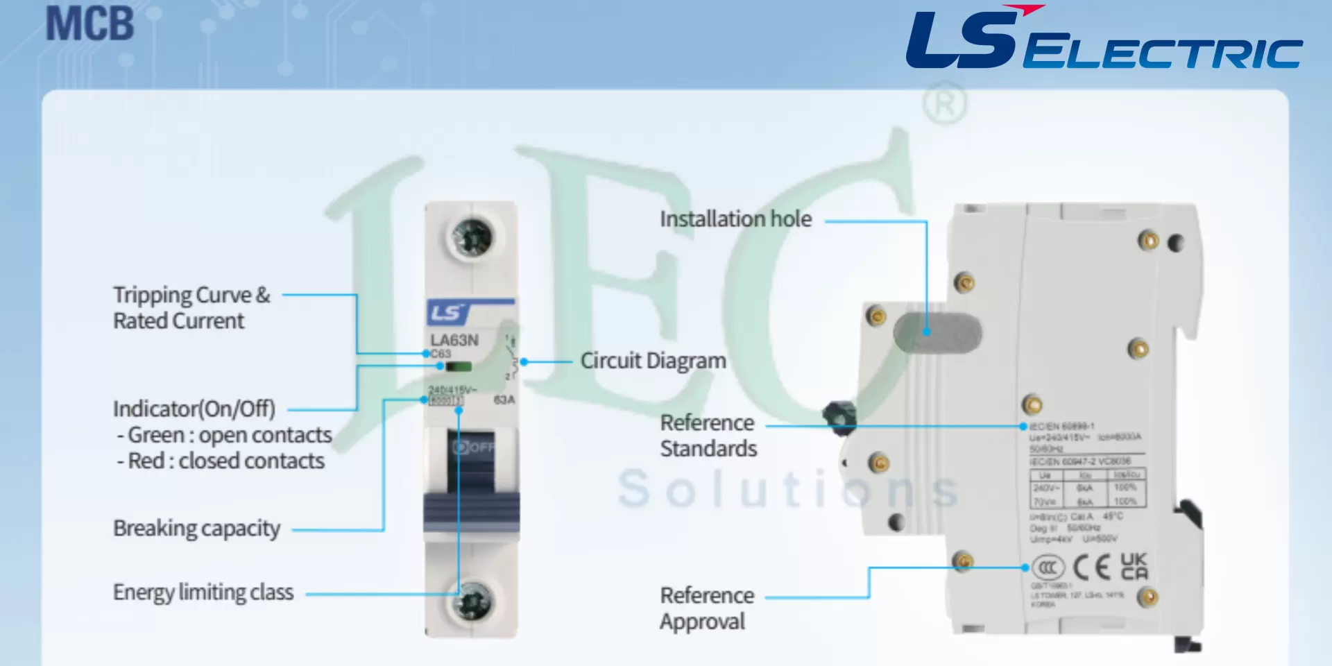 - Sang năm 2025 LS Electric ra mắt mẫu mới của MCB (Miniature Circuit Breaker), thiết bị bảo vệ chống dòng rò RCCB (Residual Current Circuit Breaker) và thiết bị bảo vệ đa năng RCBO (Residual Current Breaker with Overcurrent) có những thay đổi cơ bản như sau về ký hiệu, màu sắc như sau: