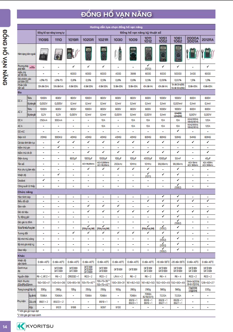 | Kyoritsu 1009 | Số | Auto range, đo diode, đo điện dung | Điện dân dụng, kỹ sư điện |