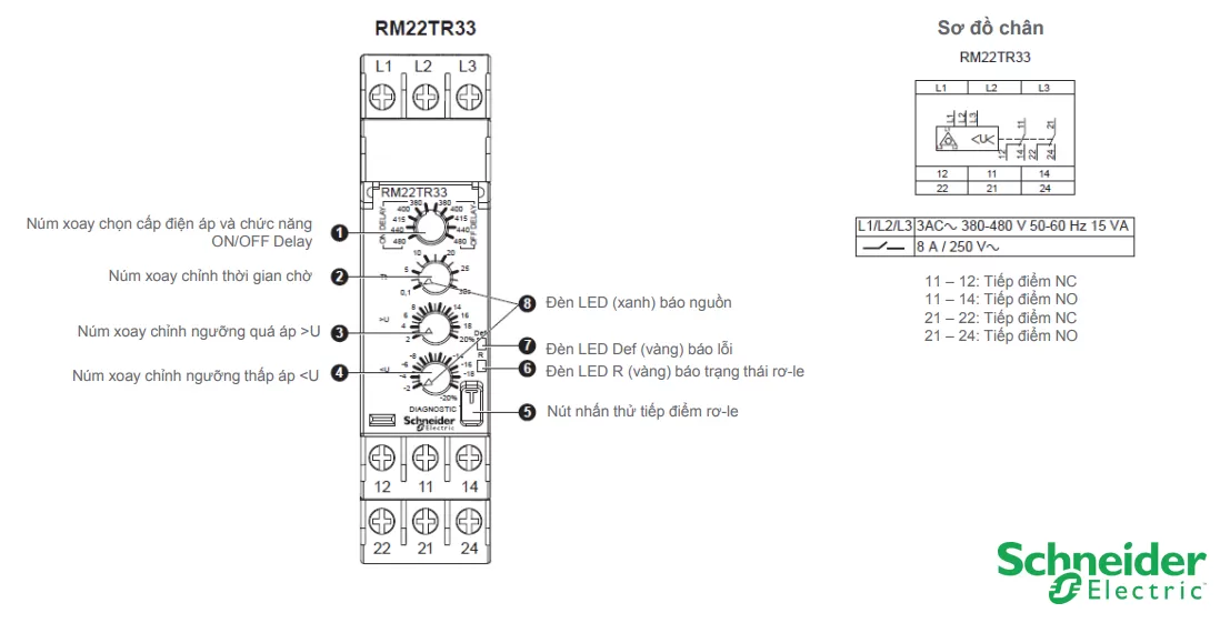 Trên đây là hướng dẫn lắp đặt, sử dụng, cài đặt Rơ le bảo vệ điện áp RM22TR33 của Schneider Electric