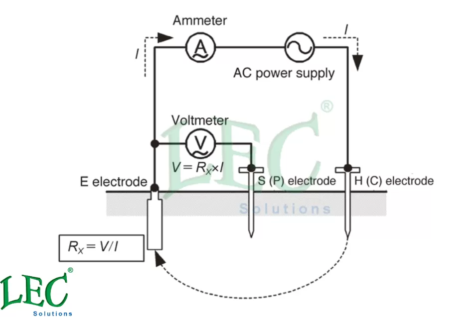 Khi đó điện trở đất RX của điện cực E được tính từ dòng điện I và điện áp V đo được. Không thể đo chính xác điện áp giữa hai điện cực H(C) và E, hay điện áp giữa H(C) và S (P) điện cực.