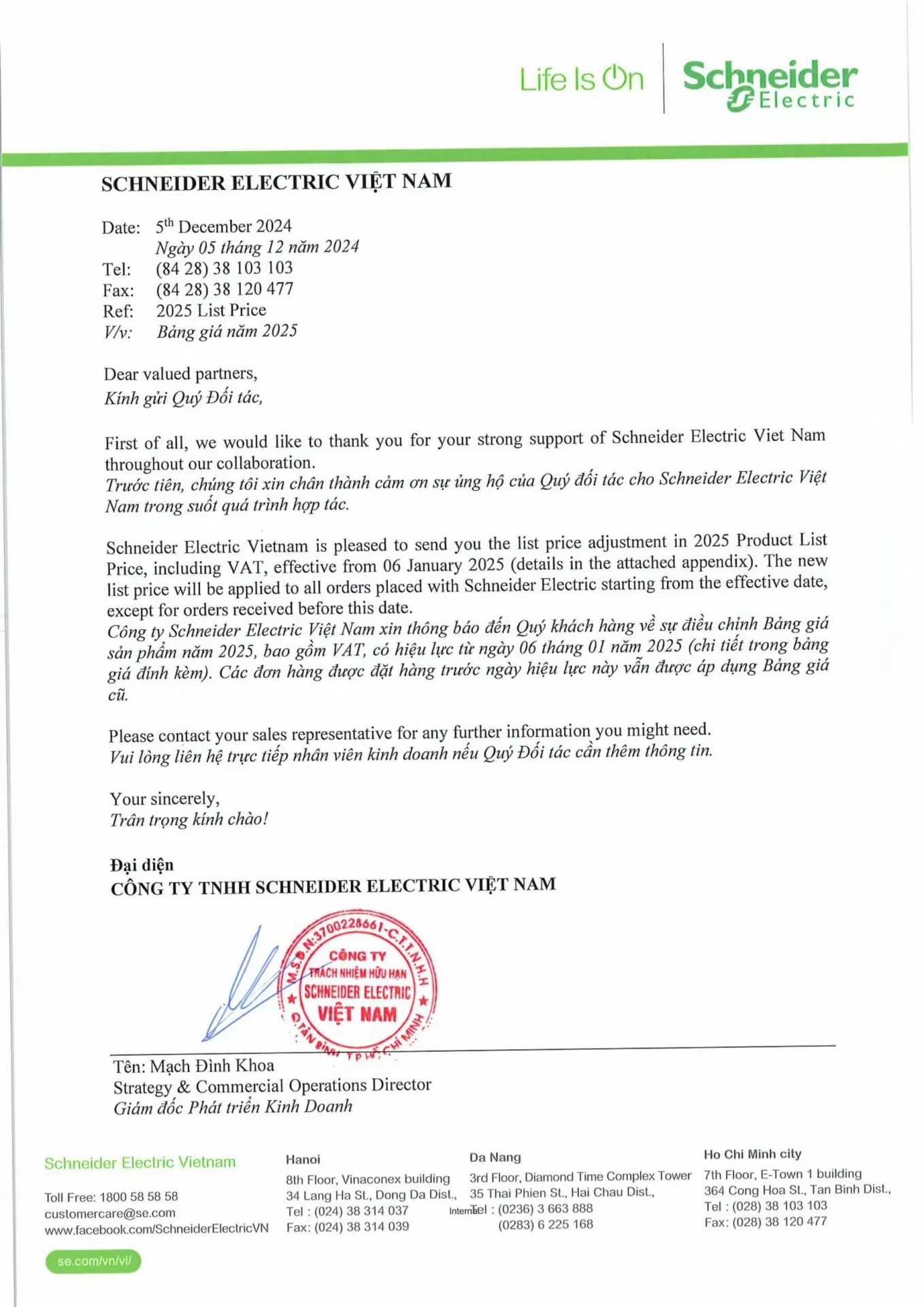Công ty Long Nguyễn xin chân thành cảm ơn sự tin tưởng và đồng hành của Quý khách hàng trong suốt thời gian qua. Chúng tôi trân trọng thông báo về việc điều chỉnh giá bán các sản phẩm thiết bị điện Schneider Electric, cụ thể như sau: