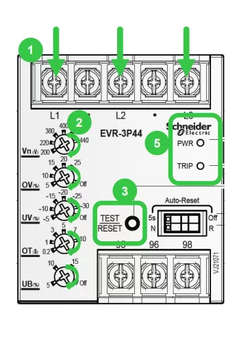 3. Trong khi nhấn nút TEST/RESET, cấp điện áp một pha (L1-L2) hoặc ba pha vào các cực L1/L2/L3.
